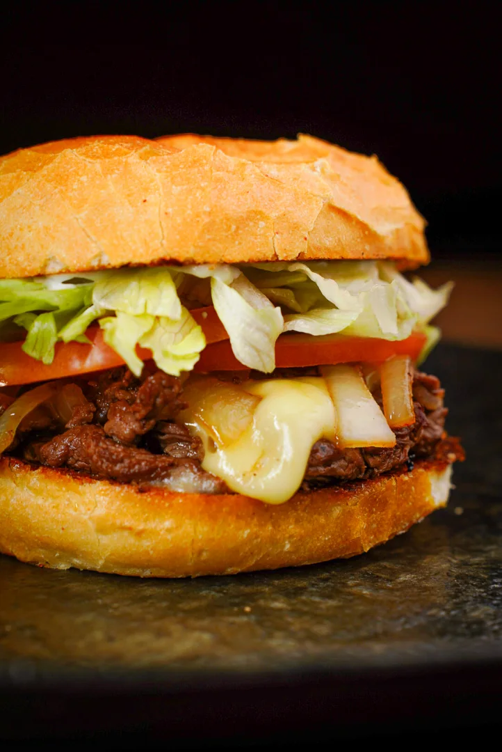 Pão francês com crostinha de queijo e selado com Catupiry, 200g (in natura) de filé mignon acebolado na chapa, queijo mozzarella, alface americana crocante e rodelas tomate.