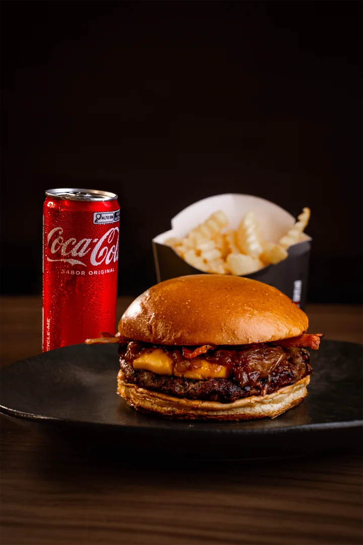 Pão brioche selado na manteiga, burger de 160g (in natura) grelhado no fogo, molho de queijo cheddar, cebola caramelizada e bacon crocante. Batata Crinkle P + Escolha o seu Refri 310ml Grátis